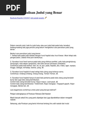 Penulisan judul karya ilmiah yang tepat sesuai kaidah eyd adalah korelasi membaca dengan tingkat kecerdasan intelektual dan hubungan sosial. Pada dasarnya hal yang akan kita bahas adalah bagaimana cara menentukan… Penulisan judul karya tulis yang tepat. Pembuatan maupun penulisan judul yang benar wajib dilakukan karena kepala karangan ini sendiri punya beberapa fungsi penting. Berikut contoh penggunaan huruf miring yang benar sesuai panduan umum ejaan bahasa indonesia (puebi) terbaru: